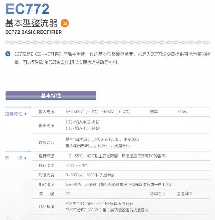 EC772/752是E-CONVERT系列产品中的基本型整流器,它是为EC751/771逆变器提供直流电源的装置,可选配制动单元及制动电阻以实现快速制动等功能。